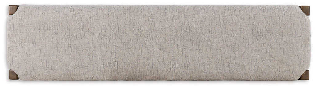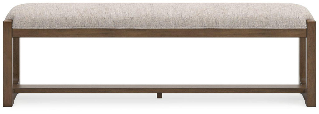 This dining bench sits comfortably at the intersection of modern lodge and farmhouse aesthetics. Your warm and welcoming disposition is reflected in its charming architectural elements and neutral textural fabric. Even with its poise, the bench remains practical. Its cushioned seat invites you to linger longer at the table, defining your dining room with reliable function and style.