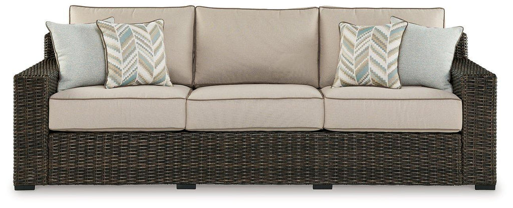 Who says the great outdoors isn’t made for luxury living? This sofa with cushion offers all the high-end design, plush comfort and durability you could ask for, and then some. Its all-weather, rust-proof aluminum frame provides the easy-breezy wicker look you love without the high maintenance. Rest assured, the high-performing Nuvella® fabric covering the cushions and throw pillows is made to stand up to the elements.
